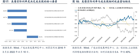 但我们认为,反映美联储货币政策变化的美债实际利率对A股成长股的抑制才是主导性的。我们观测深港通开通以来创业板指绝对收益和相对收益与分子分母端各大要素的相关性由高到低排序如下:创业板指与上证综指相对走势(相对收益)VS美债实际利率(相关性为-92.6%,下同)=创业板指走势(绝对收益)VS美债实际利率(相关性为-90.7%,下同)>创业板指相对收益VS美债名义利率(-72.3%)>创业板指绝对收益VS美债名义利率(-61.3%)>创业板相对收益VS创业板相对盈利增速(53.9%)。