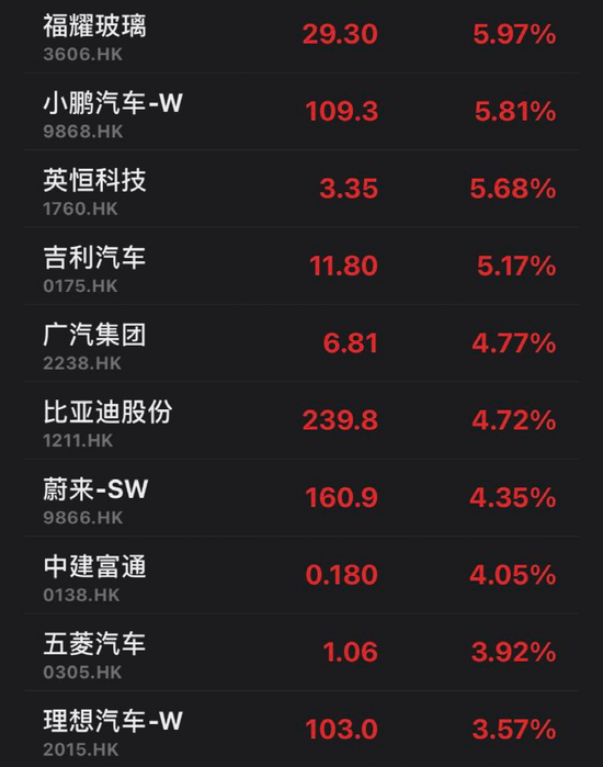 国务院常务会议鼓励汽车消费,带动汽车及汽车零部件集体拉升,福耀玻璃涨近6%,小鹏、吉利涨幅超过5%,比亚迪、蔚来和广汽涨幅超4%。