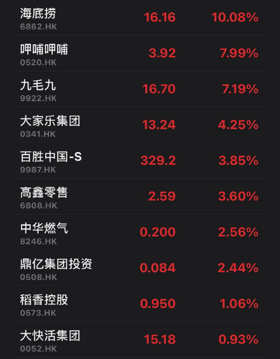 多只餐饮股涨势强劲,海底捞涨幅最高,超过10%,已经是连续第三日上涨。东方证券跟踪数据显示,近两周,海底捞获得南下资金持续加仓,累计增持297.4万股,持股比例升0.6个百分点。
