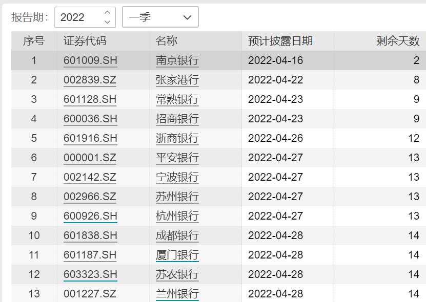 南京银行之后,自4月22日至4月底,其余41家上市银行一季报将披露完毕,扎堆披露时间集中在月底。其中,4月29日和4月30日,分别有11家、17家银行一季报集体披露。