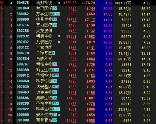 热点二:新冠检测板块涨逾4% 兰卫医学20CM涨停