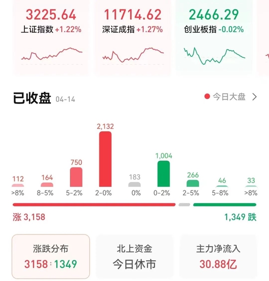 截至收盘,上证指数涨1.22%报3225.64点,深成指涨1.27%报11714.62点,创业板指微跌0.02%报2466.29点;两市合计成交8701亿元,较前一交易日略有减少。