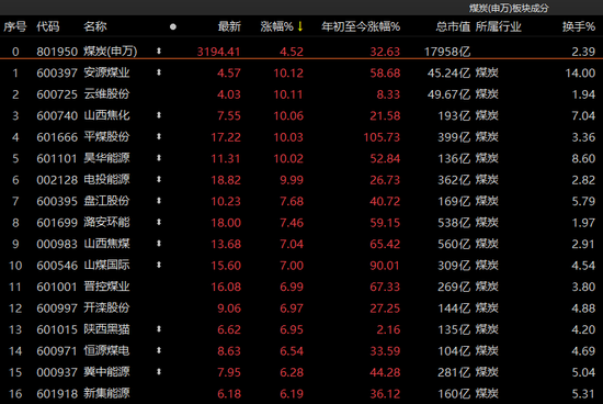 31个申万一级行业中,有27个板块飘红,煤炭以4.52%涨幅遥遥领先,该板块年内强势涨近33%,今日安源煤业等6只个股涨停。