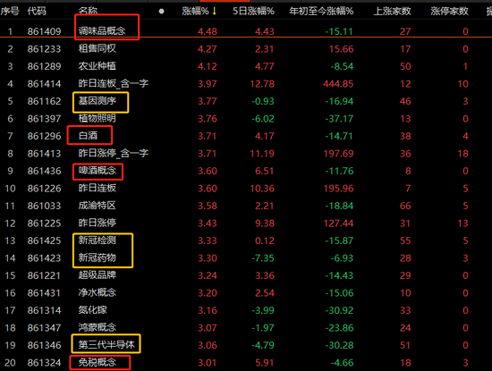 在今日涨幅超过3%的概念板块中可以看到,调味品、白酒、免税概念等大消费类个股受到资金的喜爱。第三代半导体在今日难得有了反弹,但年内跌幅仍超过30%。还有亮点在于新冠检测、新冠药物概念个股,兰卫医学20cm涨停,以岭药业10cm涨停。