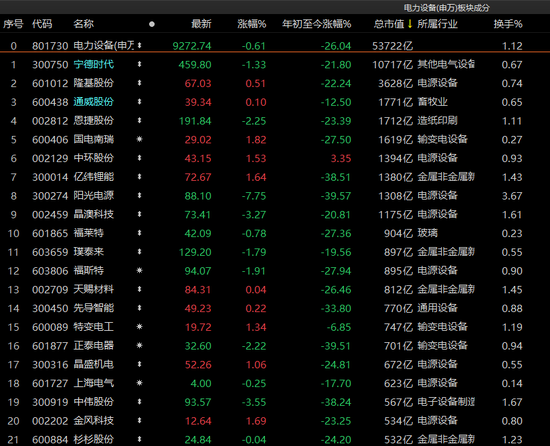 前几天重挫的电力设备板块,今日在大盘反弹的行情下却翻绿,近5日跌幅超过6%,年内跌幅超过26%。深市一哥宁德时代下跌1.33%报459.8元/股,恩捷股份跌幅超过2%,阳光电源跌幅近8%,隆基股份、通威股份、天赐材料微涨。