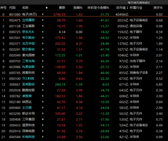 就电子板块而言,今日上涨1.83%,近5日跌幅缩至4.56%,年内跌幅以31.75%靠前。年内电子、国防军工、计算子等科技类板块表现为“难兄难弟”,今日均出现不同幅度的上涨,但年内跌幅均超过20%。