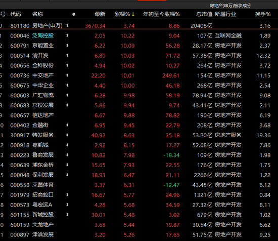 房地产板块在经历近几日的大跌熄火后,今日又掀起涨停潮,京能置业等10只个股涨停。万科A、绿地控股涨幅均超过2%,保利发展涨幅超过6%,招商蛇口、新城控股涨幅超过5%。