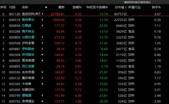 食品饮料板块涨近4%,皇台酒业(维权)等6只个股涨停。贵州茅台上涨2.26%报1809元/股,五粮液大涨5.7%报171.57元/股,海天味业涨幅超过5%。