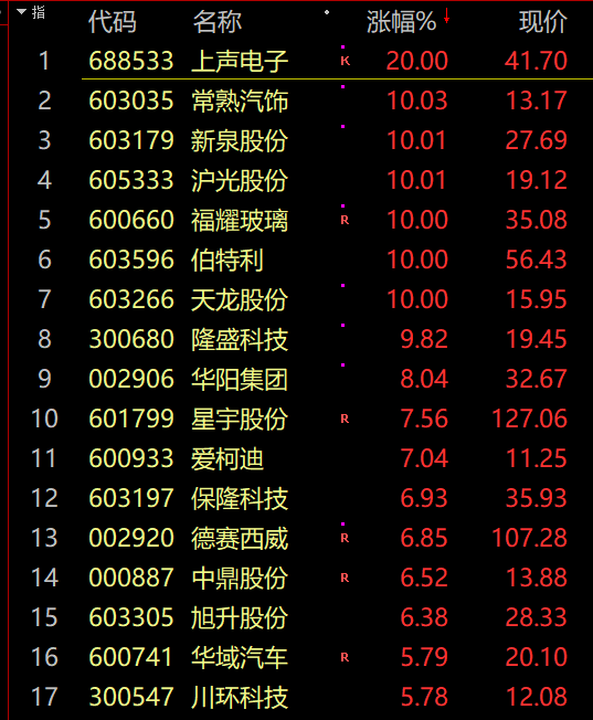 受消息影响,汽车零部件概念股拉升反弹,创业板股上声电子涨停,福耀玻璃、新泉股份涨停,常熟汽饰、星宇股份、伯特利、文灿股份、川环科技、旭升股份、拓普集团等涨超5%。