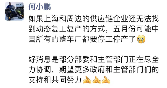 小鹏汽车董事长何小鹏也在朋友圈发文,他称如果上海和周边的供应链企业还无法找到动态复工复产的方式,五月份可能中国所有的整车厂都要停工停产了。