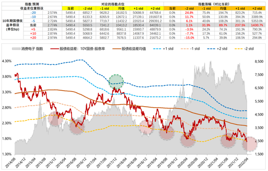 5、关键指标股债收益差更新:判断大势拐点的沪深300股债收益差处于-1X标准差(滚动)下方一点,在不考虑分红和利率变化的情况下,距离-2X标准差还有不到12%(这是理论极限值)。另外,中证500处于-2X标准差附近震荡,医药二次探底再次接近-2X标准差,消费电子近期逐步达到-2x标准差。(核心资产和消费类指数有效,成长、周期类行业不适用于该指标)。