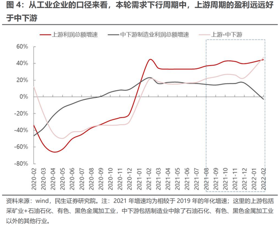 上述增速差背后其实反映了上游周期股盈利更多来自价格水平而非量的增长,与全球通胀更相关;而国内需求预期的下行(包括近期疫情的反复)使得中下游的盈利改善预期受到了压制。
