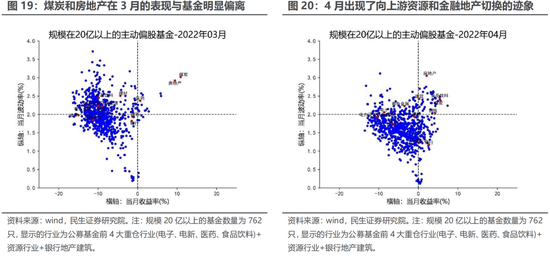 当前市场的投资者或许才刚刚感受到“新大陆”的召唤,配置大迁徙才刚刚开始。从配置结构上看:从3月和4月规模在20亿以上的主动偏股型基金月收益率和波动率分布与主要行业的对比来看,大部分基金仍与以电新、电子、医药生物等中下游成长板块更相关,但相较于3月,4月基金净值的波动率和收益率已经开始出现了向上游资源和金融地产等切换的初步迹象,但相关性仍不大。