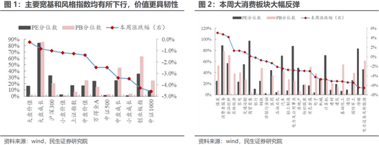 本周A股市场继续调整,主要宽基和风格指数均有所下跌,价值依旧更具韧性(大盘价值>大盘成长,中小盘价值>中小盘成长)。从具体板块表现来看,涨跌幅排名靠前的集中于大消费板块(消费者服务、食品饮料、农林牧渔、家电等),排名靠后的是则以电新、国防军工为代表的制造业成长板块。