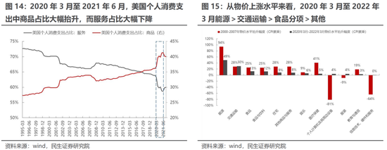 而这一点类似于2020年美国在疫情爆发之后出现的以实物消费代替服务消费的情形:由于政府补贴等政策对于实物消费的刺激,下游需求有所恢复:我们可以明显看到2020年3月至2021年6月,美国个人消费支出中对于商品的支出占比从36.81%大幅抬升至41.32%,抬升幅度为4.51%,而相比之下2000-2007年7年的时间也才抬升了3.90%。在上述对于实物商品消费大幅增长的背景下,更为重要的是,在供应链瓶颈的约束之下,下游需求恢复带来了美国通胀水平的不断攀升,创造了近40年以来的最高水平:从分项水平来看,主要是能源、交通运输、食品分项上涨最多,而服务分项涨幅不大。