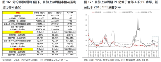但从市场定价来看,无论是从哪种测算口径,目前上游周期的市值与盈利占比都与上述基本面趋势不匹配,尤其是非金融口径下,上游周期市值/盈利仅为53.09%。而从估值来看:上游周期PE仍低于全部A股PE水平,甚至低于2018年年底的水平;而非上游周期金融板块的PE却大幅高于市场整体。