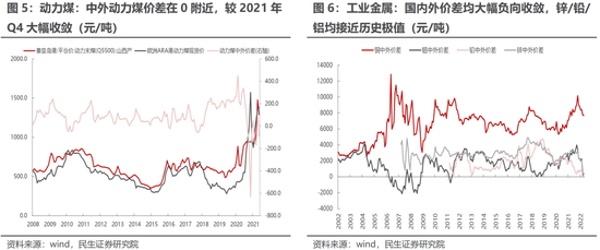 当下海外资源的价格对国内形成了系统性的输入性通胀压力,其会通过直接或间接(例如终端可贸易部门)的途径传导至国内。我们从国内外能源和主要工业金属的价格差异可以看到:当前国内动力煤现货价格仍处高位,海外大幅攀升,价差较2021年Q4收敛至0附近,考虑到运费后几乎没有了进口的可行性;而主要工业金属的价差均大幅负向收敛,除铜以外,锌/铅/铝均接近于0值,处于历史低位。国内需求的下滑可能只是意味着减少了部分大宗商品需求,为本来紧缺的海外市场“孔融让梨”。正是因为上游资源品具备部分独立于国内经济的逻辑,才让其在过去一个季度受困于疫情与经济下行的市场中,几乎是一枝独秀的存在。