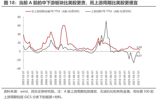 这意味着A股真正便宜的原因是因为上游周期与金融:与美股进行对比我们发现,当前A股的非上游金融板块相比于标普500的PE估值水平差异仍为+3.09;但是A股上游周期相比于标普500的PE估值水平差异为-4.01,仍处于2003年以来鲜有的负值区间内。