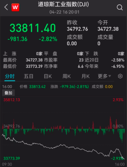 北京时间4月23日凌晨,美股周五大幅收跌,三大指数均重挫逾2%,道指暴跌近千点,创下近一年半以来最大单日跌幅。
