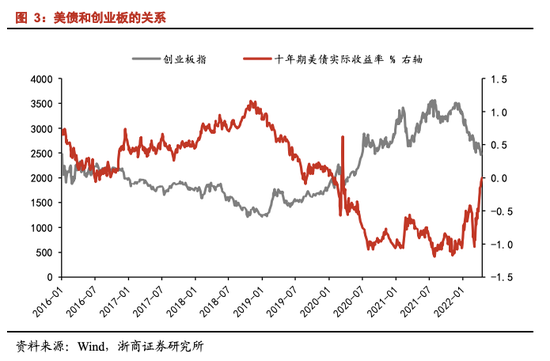美债收益率与成长指数走势具有较强的负相关性。从历史经验来看,成长风格股价走势往往与美债收益率走势相反,在2016年至今期间,十年期美债实际收益率呈现为“先上-后下-再上”的趋势,而同期创业板指市场表现则正好相反。