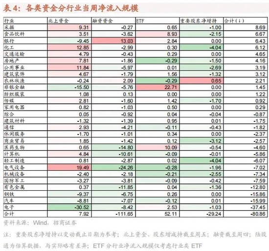 【资金·众寡】两融资金继续流出,ETF 延续大幅申购。北上资金本周净流入4.5 亿元;融资资金前四个交易日合计净流出 117.8 亿元;新成立偏股类公募基金 22.7 亿份,较前期上升 9.4 亿份;ETF 净申购,对应净流入 153.0 亿元。行业偏好上,北上资金净买入规模较高的为电气设备、化工、公用事业等;融资资金净买入银行、农林牧渔、纺织服装等;券商 ETF 申购较多,军工 ETF 赎回较多。重要股东净减持规模扩大;计划减持规模下降。