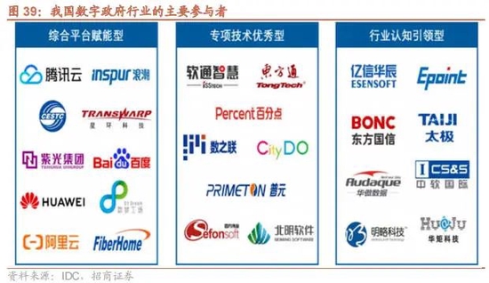根据IDC发布的《中国政务数据治理解决方案市场份额(2020)》报告,我国数字政府的主要参与企业包括综合平台赋能型,如浪潮、紫光。华为、百度、阿里、腾讯等,专项技术优秀型,如东方通、普元、软通智慧等,还有行业认知引领性,如太极、东方国信等。