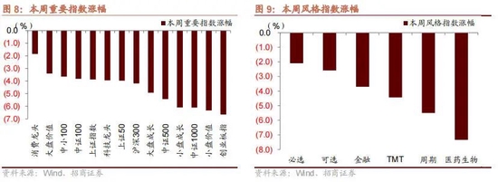 从行业上来看,本周申万一级行业多数下跌,仅 1 个一级行业上涨,纺织服装板块上涨 4.09%,房地产、钢铁、有色金属板块跌幅较大,均超过 8%。从涨跌原因来看,本周上涨的行业原因主要为,纺织服装板块主要受益于本周汇率的大幅贬值,由于汇率贬值带来的出口优势的增加。房地产、钢铁、有色一方面由于前期市场交易稳增长,但由于新开工等尚未大幅好转,叠加对疫情影响开工的担忧,造成短期博弈预期的交易型资金流出,此外,本周发改委继续强调压减粗钢产量,而海外加息主要为了抑制通胀,因此对部分大宗商品的情绪短期带来影响。