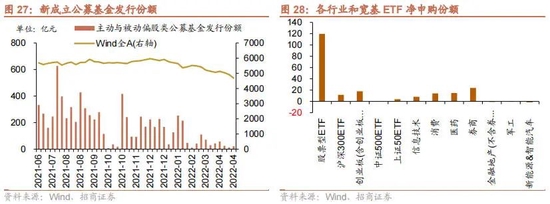 从 ETF 净申购来看,ETF 净申购,宽指 ETF 均为净申购,其中创业板(含创业板 50)ETF 申购最多;行业 ETF 以净申购为主,其中券商 ETF 申购较多,军工 ETF 赎回较多。具体来看,股票型 ETF 总体净申购 117.6 亿份。其中,沪深 300、创业板 ETF、中证 500ETF、上证 50ETF 和双创 50ETF 分别净申购 8.5 亿份、净申购 17.8 亿份、净申购 1.8 亿份、净申购 5.5 亿份、净申购 5.7 亿份。行业方面,信息技术 ETF 净申购 6.2 亿份;消费 ETF 净申购 13.3亿份;医药 ETF 净申购 15.0 亿份;券商 ETF 净申购 24.5 亿份;金融地产 ETF 净申购 2.9 亿份;军工 ETF 净赎回0.6 亿份;原材料 ETF 净赎回 0.4 亿份;新能源&智能汽车 ETF 净申购 0.8 亿份。