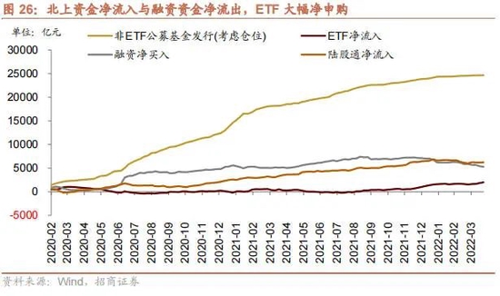 从全周资金流动的情况来看,本周北上资金呈现小幅净流入态势,融资资金净流出,新成立偏股类公募基金上升,ETF 净申购。具体来看,北上资金本周净流入 4.5 亿元;融资资金前四个交易日合计净流出 117.8 亿元;新成立偏股类公募基金 22.7 亿份,较前期上升 9.4 亿份;ETF 净申购,对应净流入 153.0 亿元。