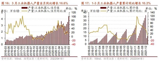 3 月份工业机器人产量当月同比增幅扩大。3 月工业机器人当月产量为 44322 台/套,当月同比增长 16.60%,增幅较1 月扩大 1.5 个百分点,当月产量相比 2020 年同期增长 157.07%。2022 年 1-3 月工业机器人累计产量为 102496 台 /套,同比增长 10.20%,增幅较 2022 年 1-2 月缩窄 19.4 个百分点,累计产量较 2020 年同期增长 195.84%。