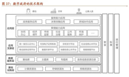 ※ 应用层:对应业务架构的规划,分为服务能力应用和管理能力应用。服务能力应用包括政务服务、决策保障、跨域协作应用,管理能力应用包括行政办公、经济调节、市场监管应用、社会治理、公共服务、环境保护应用。