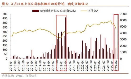 另外,3 月以来上市公司积极抛出回购计划,稳定市场信心。以预案日期为参考,3 月和 4 月(截止 4 月 24 日)上市公司发布的回购预案对应的拟回购规模分别为 345 亿元和 122 亿元,在历史上属于较高水平,上一次相当规模的回购预案出现在 2018 年末-2019 年初。