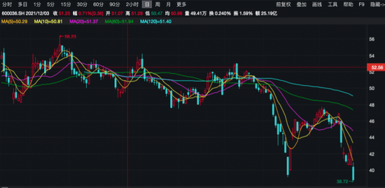 受田惠宇被调查、管理层更迭等因素影响,近日来招商银行股价A、H股大幅下跌。4月25日,招商银行开盘再次大跌,截至收盘,A股报收38.83元,下跌8.64%;港股报收46.70港元,下跌10.28%。同时,招商银行现身沪股通十大成交活跃股, 成交净卖出2.75亿元。