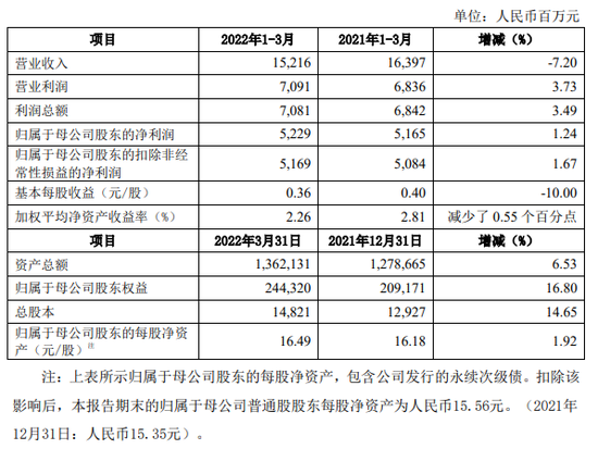 当期营业收入152.16亿元,同比下滑7.20%;归母净利润为52.29亿元,同比略增1.24%。而在2021年一季度,中信证券营收和净利润的同比增幅分别为27.58%和26.73%。