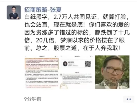 就在上个周末,招商证券策略首席张夏在朋友圈公开发文称:“白纸黑字,2.7万人共同见证,就算打脸,也会站直,现在就是底!你们喜欢的、爱的因为贵涨多了错过的标的,都跌到了十几、20几倍,梦寐以求的价格摆在了眼前。总之,股票之道,在于人弃我取,“”