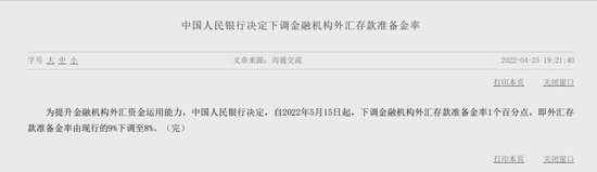 忙碌至晚间的行家,刚刚从弹窗中得知,为提升金融机构外汇资金运用能力,中国人民银行决定自2022年5月15日起,下调金融机构外汇存款准备金率1个百分点,即外汇存款准备金率由现行的9%下调至8%。
