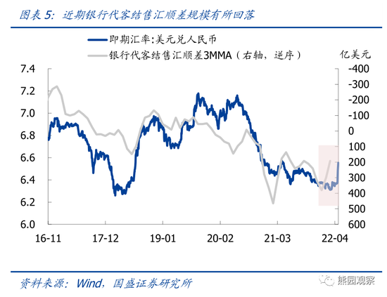 3)由于季节性因素消退和出口下滑,银行代客结售汇顺差有所回落(图5),再考虑到当前我国采取全面封控、全球则总体趋于“躺平”,后续我国出口走弱的预期升温;