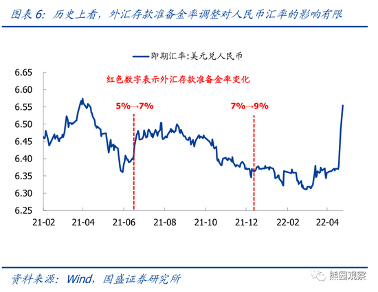 另一方面,4月25日,央行宣布自5月15日起将外汇存款准备金率由9%下调至8%,旨在缓解人民币贬值压力。但从历史上看,外汇存款准备金率调整对人民币汇率的影响较为有限(图6)。往后看,我们预计人民币汇率短期仍趋于贬值,但随着国内疫情逐步得到控制,叠加美元指数进一步上涨空间不大、美债收益率也难以持续上行等因素,人民币贬值幅度有限,但总趋势上应是贬中趋稳,其中,6.7左右是一个重要观测点位。