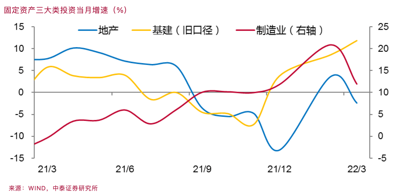而民间投资更多集中在房地产投资方面,从一季度的数据看,全国房地产开发投资27765亿元,同比仅增长0.7%。尤其是3月全国房地产销售面积同比增速-17.7%,整体看土地市场景气度仍较低,在房地产稳增长政策持续出台的背景下,3月份土地购置面积仍出现高达40%的负增长。此外,在国内疫情反复下,本已疲弱的地产销售持续低迷,印证居民部门新增中长贷同比延续负增,如3月份新增居民中长贷同比下降40%,反映居民部门的购房意愿大幅下降。
