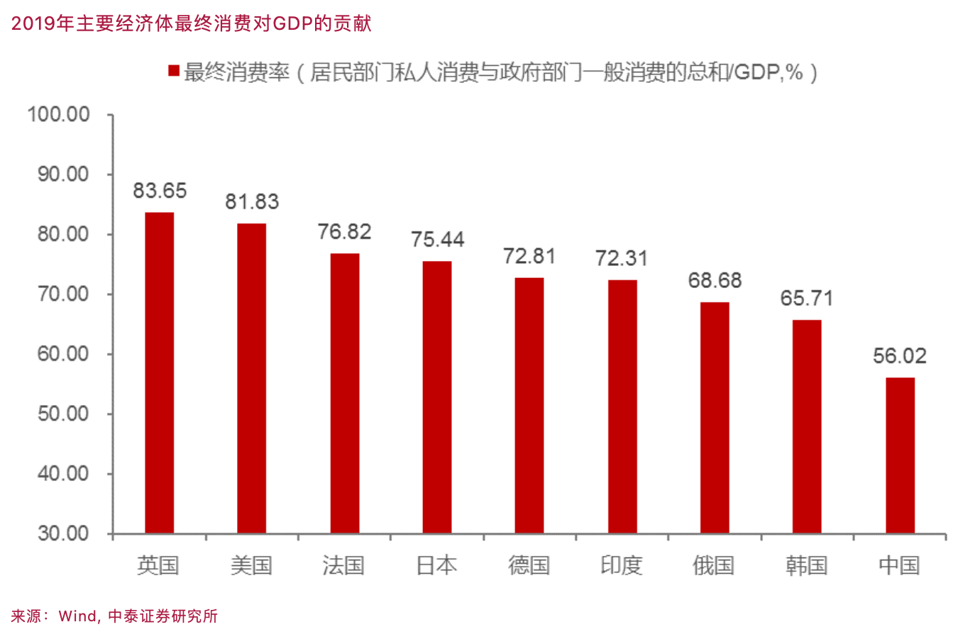 消费是反映人们对美好生活追求的最直接体现,在拉动GDP增长的三驾马车中,消费的占比最高,以疫情前的统计数据为例,美国最终消费占GDP的比重达到84%,印度为72%,而中国只有56%。说明中国经济的增长模式主要靠投资拉动,如2020年投资(资本形成)对GDP的贡献超过40%,是全球平均水平的两倍左右。
