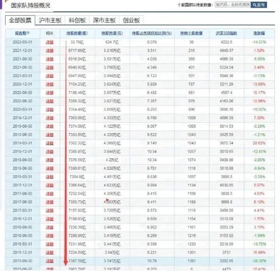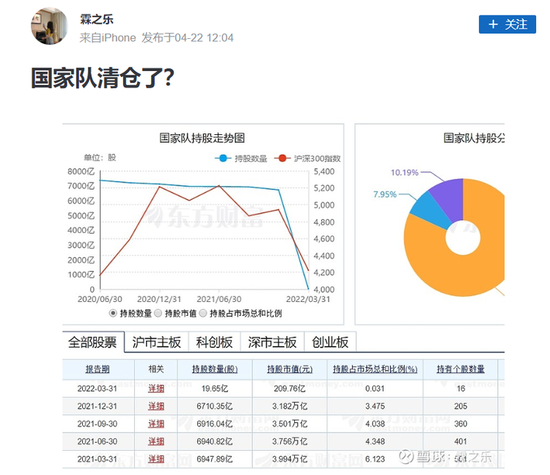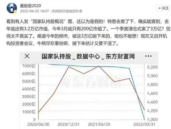 其中不乏粉丝超过60万的财经大V也指出,“国家队持股概况”在东方财富网确实能查到,去年底还有3.2万亿市值,今年3月底只有200亿市值了。一个季度清仓式卖了3万亿?难道今年的熊市,被这3万亿砸下来的,咱也不敢想!