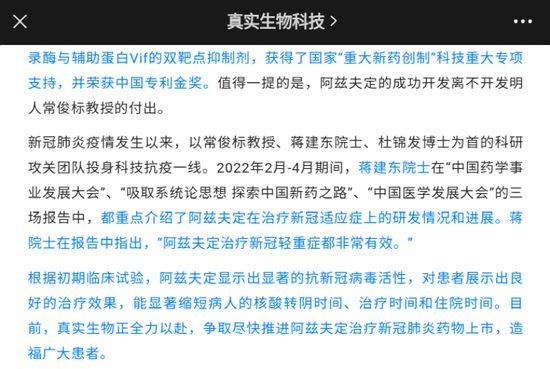 据了解,阿兹夫定本来是一种艾滋病治疗药物,但被寄希望对新冠肺炎产生良好疗效。药品研发方真实生物也在其官方公众号指出,“初期临床试验中,该药物展示出显著的抗新冠病毒活性,对患者展示出良好的治疗效果,能显著缩短病人转阴治疗和住院时间”。