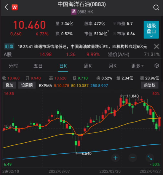 随着油价反弹,近两日大跌10%的港股中海油反弹6.73%,A股今日涨停。