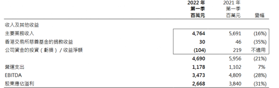 一季度,港交所营收下滑21%至46.9亿港元,收入下滑叠加投资损失和营收开支增加,净利同比减31%至26.68亿港元。
