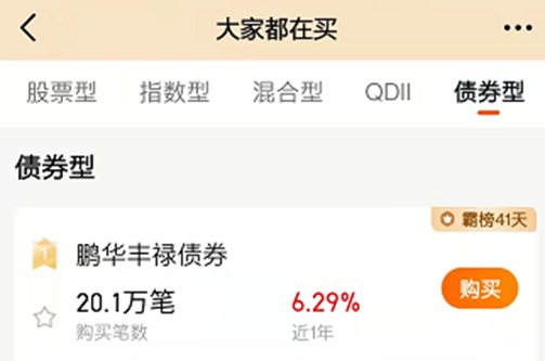 截至4月27日午间,鹏华丰禄以购买笔数20.1万笔的记录,位居债券型首位。并且标注了“霸榜41天”。