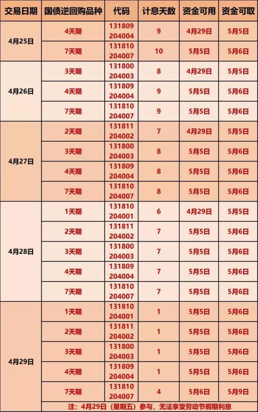 4月28日(周四),投资者可以借出1天期逆回购(沪市逆回购简称GC001,代码204001;深市逆回购简称R-001,代码131810),就可以收获6天利息,资金在5月5日盘前已可用,虽不能提现,但可进行股票交易。