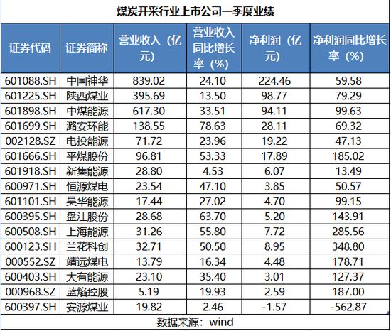 业绩超预期的细分板块主要集中在石油开采、煤炭开采领域。煤炭开采方面,16家上市公司一季度平均净利润增速达88%、营业收入增同比增长34%。龙头公司中国神华、陕西煤业、中煤能源净利润分别同比增长59.6%、79.3%、99.6%。