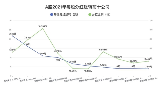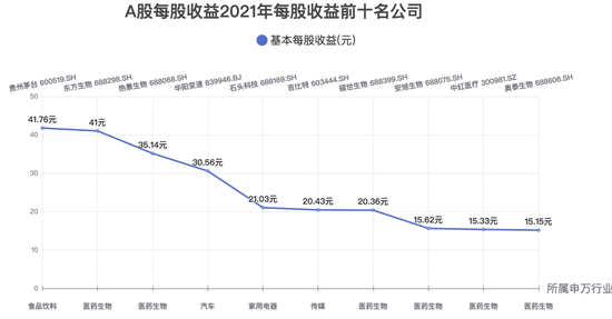 作为A股“最赚钱”指标,从每股收益看,“股王”贵州茅台再得头筹,2021年基本每股收益再创新高,达41.76元。紧随其后为东方生物和热景生物,2家生物诊断试剂公司去年每股收益分别激增至41元、35.14元。