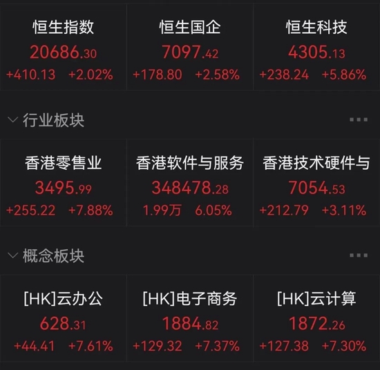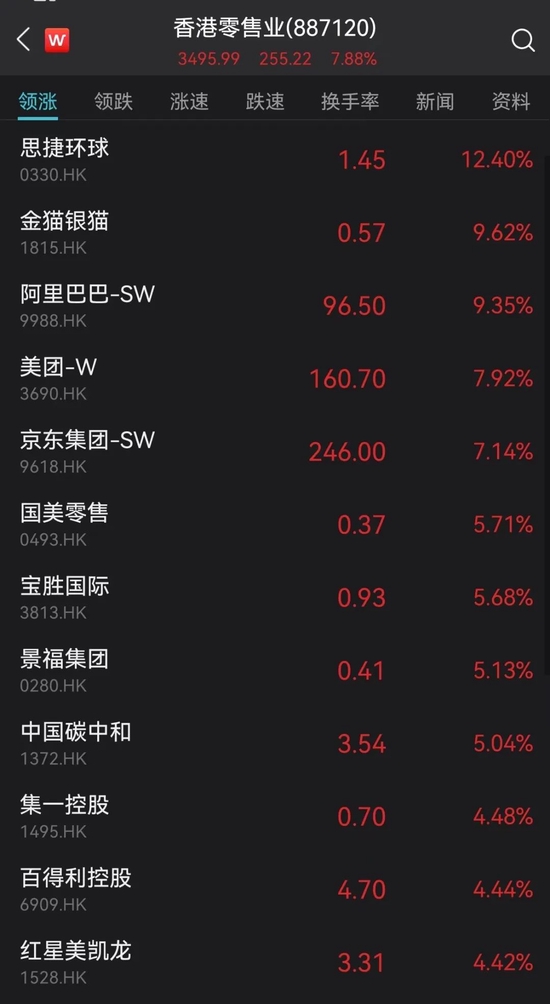 因此,香港零售业领涨。除了阿里巴巴、美团、京东等领涨外,国美零售、红星美凯龙也跟涨。