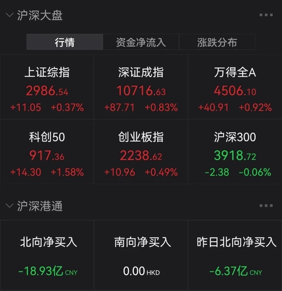 截至午间收盘,上证指数午盘报2986.54点,涨0.37%;创业板指报2238.62点,涨0.49%;深证成指报10716.63点,涨0.83%。